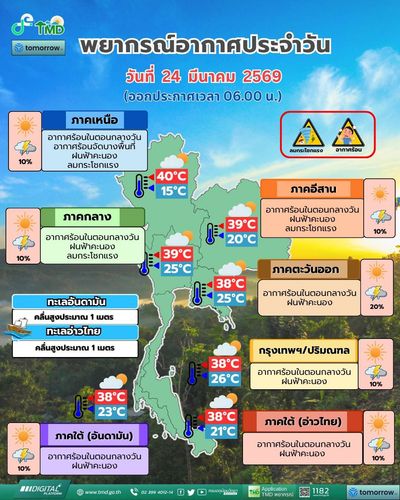 23 марта Таиланд столкнётся с экстремально жаркой погодой, особенно на севере, где температура достигнет 40°C, при этом сохраняются риски гроз и сильного ветра. Дополнительным фактором остаётся загрязнение воздуха, которое усиливает негативное влияние жары на жителей.