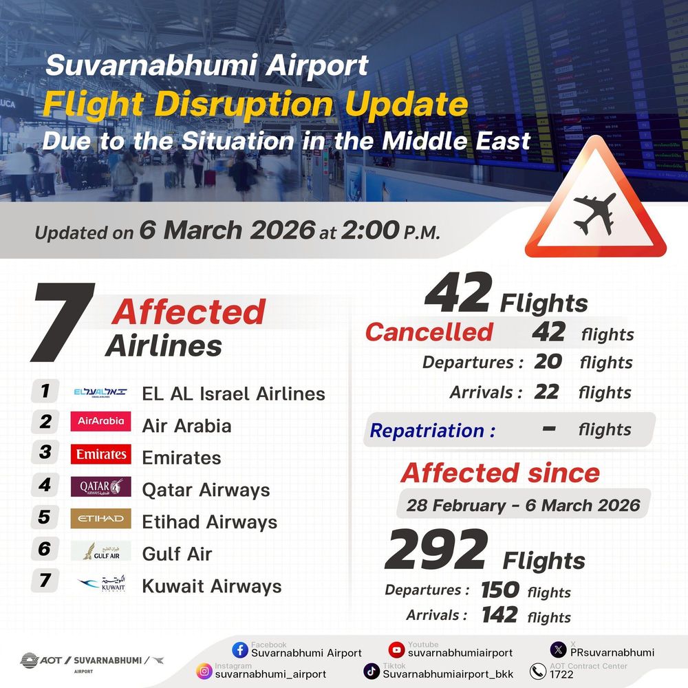 Последний отчёт увеличивает общее число нарушенных рейсов в аэропорту Суварнабхуми до 292 (в обоих направлениях) с момента, когда Вашингтон и Тель-Авив начали первую волну авиаударов по Ирану в субботу.
