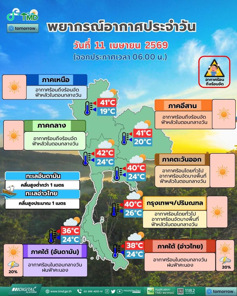 В период празднования Сонгкрана — с 11 по 16 апреля 2026 года — в Таиланде ожидается жаркая и местами экстремально жаркая погода. По данным Метеорологического департамента страны, температура в северных, северо-восточных и центральных регионах может достигать +42°C.