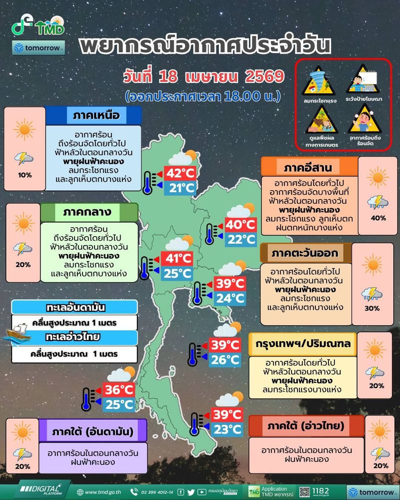 Таиланд продолжает находиться под влиянием опасной погоды. Метеорологический департамент выпустил уже девятое предупреждение 2026 года, сообщив, что до 20 апреля во многих районах верхнего Таиланда сохранятся летние штормы, сильные ливни, град, шквалистый ветер и экстремальная жара до 42°C.