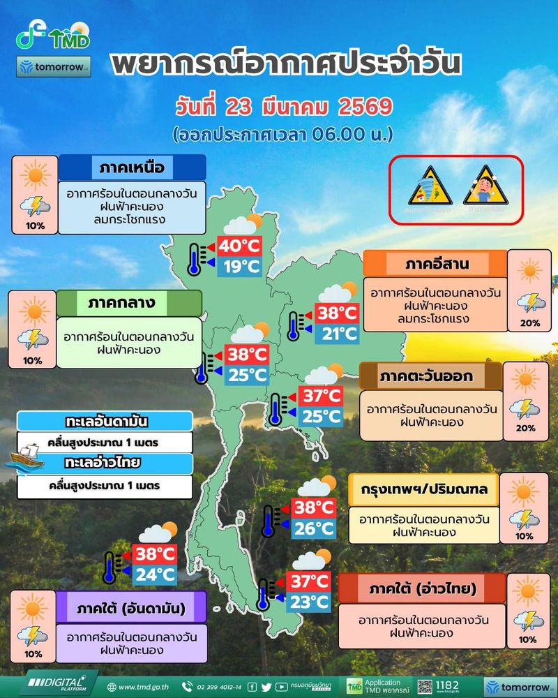 В период 25–29 марта верхняя часть Таиланда станет ещё жарче, при этом в некоторых районах севера и центра ожидается сильная жара. Местами сохранятся грозы и порывистый ветер из-за продолжающегося влияния области низкого давления. В то же время южные и юго-восточные ветры ослабнут.