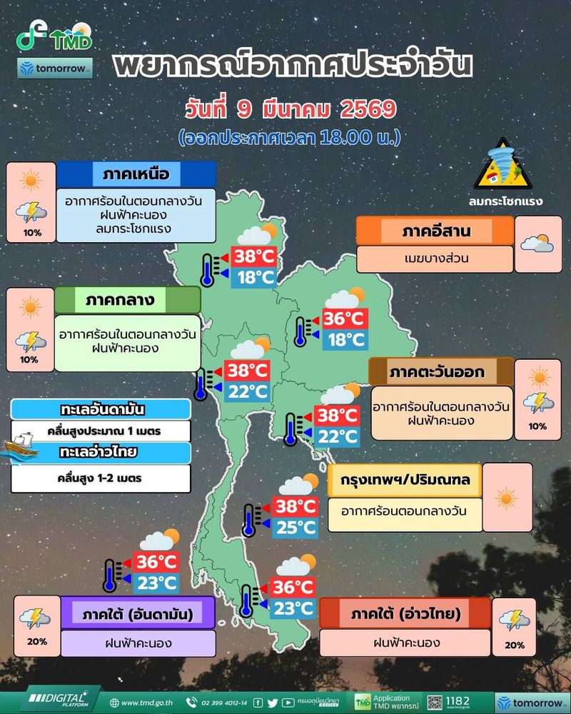 Thai Meteorological Department (TMD) выпустил первое предупреждение о летних штормах в верхней части Thailand. По данным ведомства, неблагоприятные погодные условия ожидаются с 11 по 13 марта.