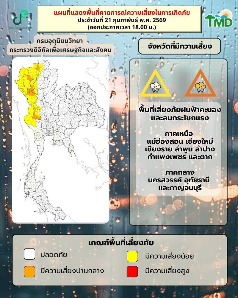 По данным синоптиков, область высокого давления над северо-востоком страны и Южно-Китайским морем ослабевает. Одновременно южные и юго-восточные ветры приносят влагу в верхнюю часть Таиланда, что создаёт условия для гроз.