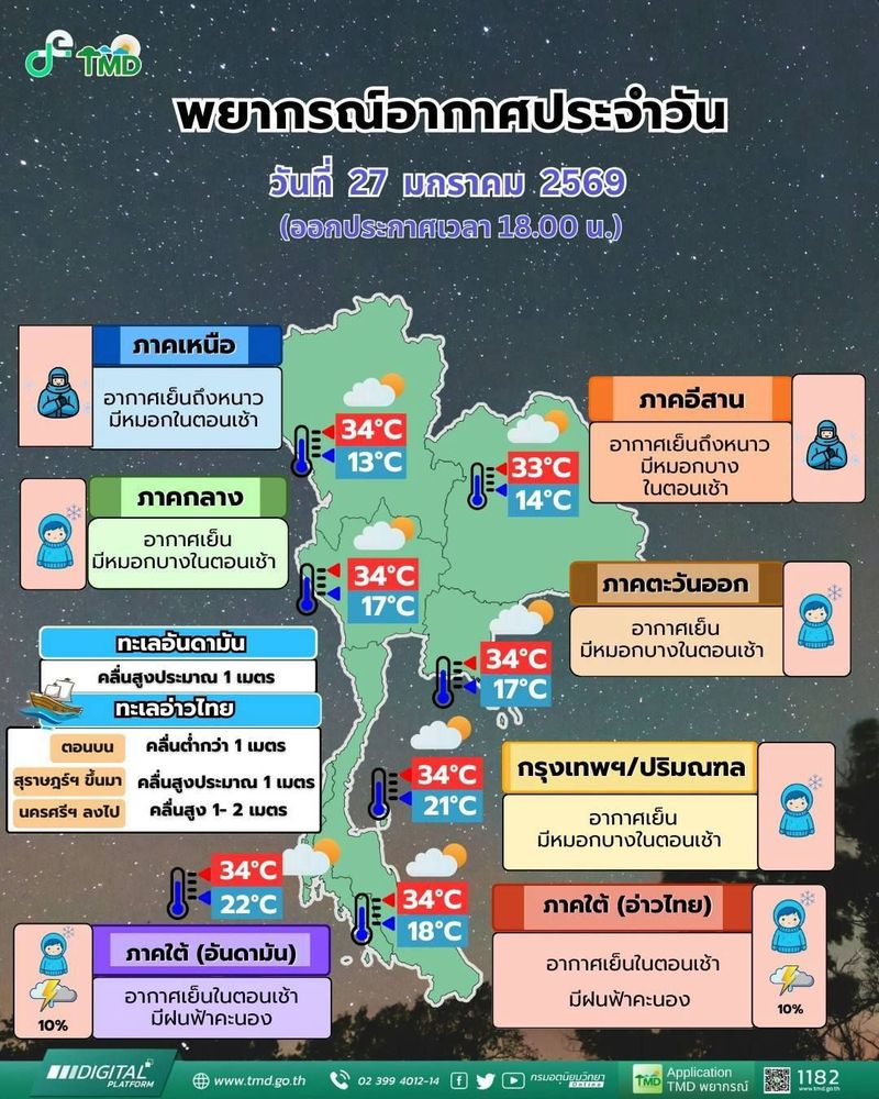 По данным TMD, в период с 27 по 31 января текущая холодная воздушная масса, накрывающая верхний Таиланд и Южно-Китайское море, начнёт ослабевать.