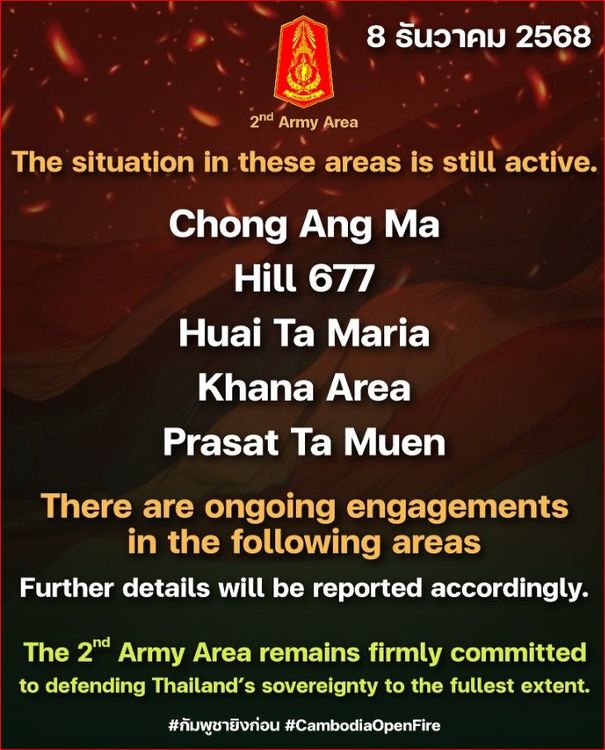 8 декабря 2025 года обстановка на тайско-камбоджийской границе — в Таиланде — резко обострилась. Второй армейский округ Таиланда сообщил об активности сразу в нескольких районах: Чонг Анг Ма, высота 677, Хуай Та Мария, район Кхана и Прасат Та Муен. Ситуация там остаётся напряжённой и развивается динамично.