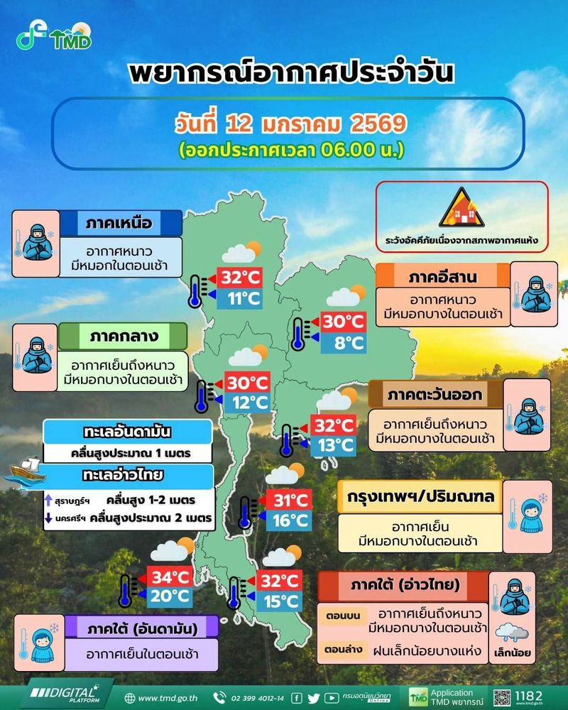 В Таиланде установилась холодная погода из-за мощного антициклона: на Севере и Северо-Востоке температура опускается до 8 °C, в Бангкоке — до 16–19 °C. Власти предупреждают о рисках для здоровья, пожароопасности из-за сухого воздуха и призывают моряков соблюдать осторожность из-за волн в Сиамском заливе и Андаманском море.