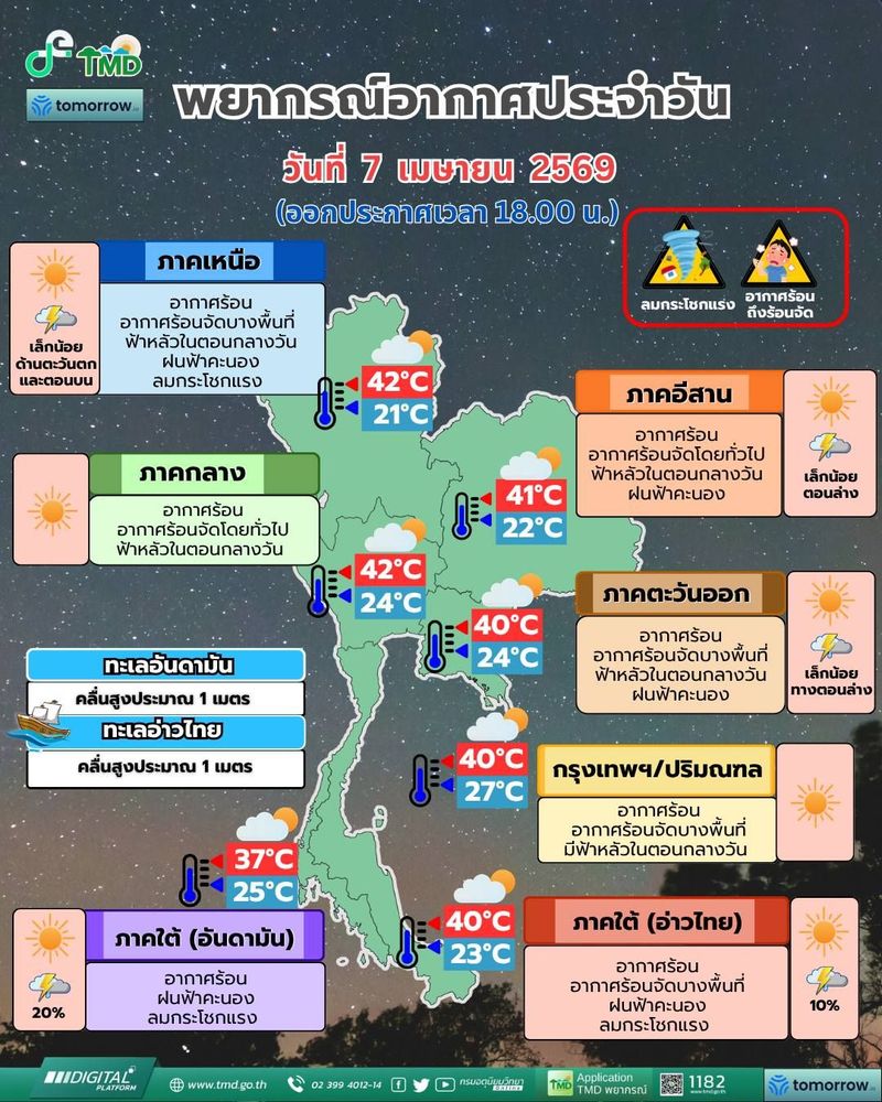 Таиланд продолжает находиться под воздействием мощной волны жары: до 8 апреля температура в ряде регионов достигнет 40–42°C, в то время как на юге страны ожидаются грозы и сильный ветер. Сочетание жары, дымки и нестабильной погоды усиливает риски для здоровья и инфраструктуры.