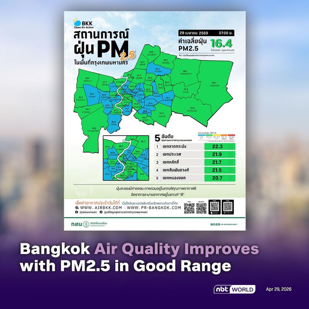 Центр мониторинга качества воздуха Бангкока сообщил, что утром ситуация в столице оставалась благоприятной. Средний уровень мелкодисперсной пыли PM2.5 составил 16,4 мкг/м³, что значительно ниже национального предельного значения 37,5 мкг/м³.