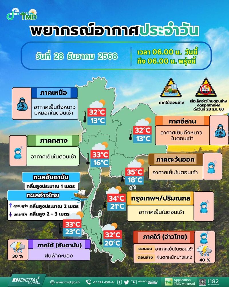 В Таиланде сохраняется влияние холодной воздушной массы из Китая: в северных и северо-восточных регионах ожидается холодная и местами очень холодная погода с возможными заморозками в горах, тогда как в нижней части юга идут сильные дожди с риском паводков. Одновременно в нижнем Сиамском заливе наблюдается опасное волнение моря, поэтому маломерным судам рекомендовано оставаться на берегу и жителям прибрежных районов — соблюдать повышенную осторожность.