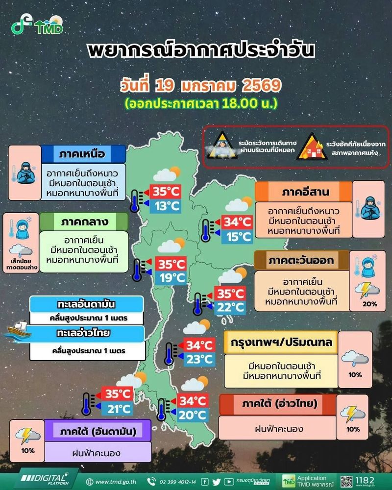 Согласно прогнозу, температура в северных и северо-восточных провинциях Таиланда снизится на 1–3°C, что приведёт к устойчивым прохладным и холодным условиям, особенно в утренние часы и в горных районах.
