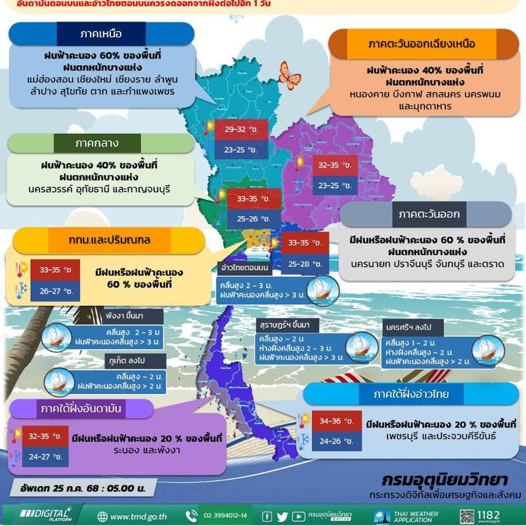 На ближайшие дни в северных и восточных регионах Таиланда ожидаются умеренные и местами сильные дожди с грозами, при этом уровень воды в некоторых районах остаётся высоким, требуя осторожности. Три тропических шторма в регионе не угрожают Таиланду, однако их развитие и траектории будут внимательно отслеживаться.