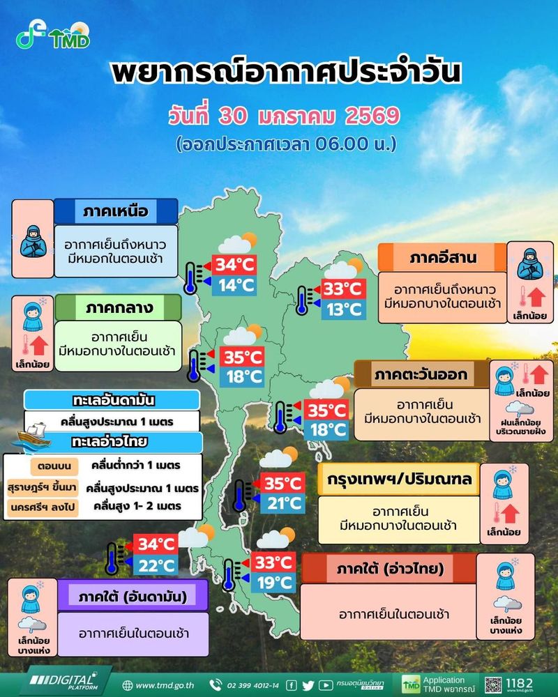 Большая часть Таиланда в ближайшие сутки столкнётся с прохладной погодой по утрам и лёгким туманом, после чего ожидается общее повышение температуры. На юге страны прогнозируются кратковременные осадки и местами усиление ветра из-за умеренного северо-восточного муссона.