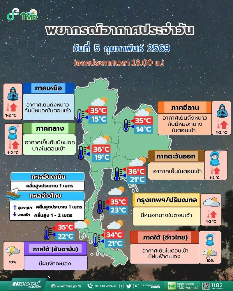 Согласно прогнозу TMD, в Сиамском заливе и Андаманском море ожидается умеренное волнение. В нижней части Сиамского залива высота волн может достигать около двух метров, а в районах гроз — превышать этот показатель.