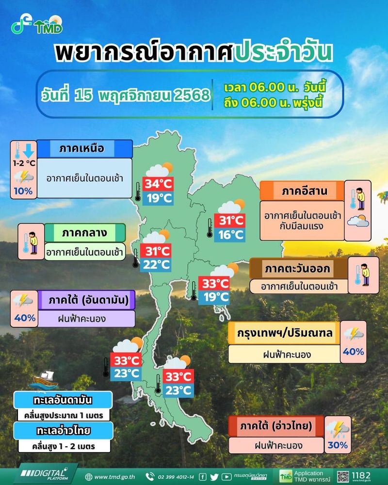 По данным TMD, в середине ноября в Таиланде начинается влияние массы холодного воздуха сильной интенсивности, поступающей из Китая и распространяющейся на: