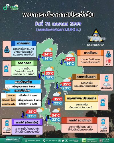 Похолодание на 1–2 °C и утренние туманы ожидаются в большинстве регионов Таиланда из-за прихода области высокого давления из Китая, на востоке возможны кратковременные дожди. На юге осадков будет немного, но в заливах сохранятся умеренные волны, поэтому жителям и водителям рекомендуют соблюдать осторожность из-за переменчивой погоды и плохой видимости.