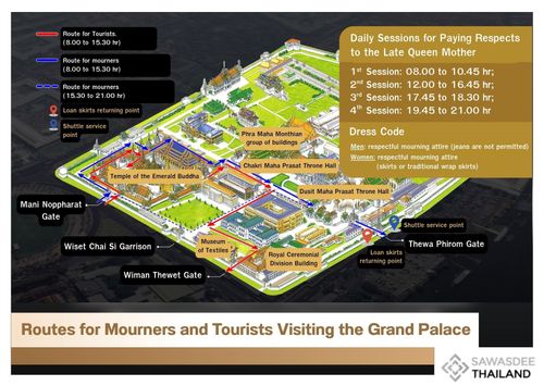 Посетителям предоставлены чёткие маршруты и расписание для выражения почтения покойной Королеве-матери Сирикит и осмотра Большого дворца, чтобы обеспечить порядок и уважительную атмосферу. Организация движения, дресс-код и транспортные услуги направлены на то, чтобы сделать посещение удобным, безопасным и достойным памяти Ее Величества.