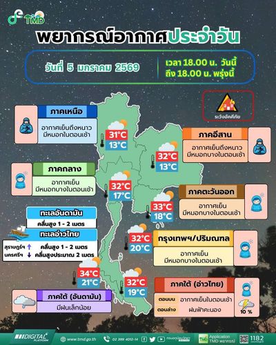 Похолодание в Таиланде сохранится как минимум до 10 января из-за последовательных холодных воздушных масс из Китая, что приведёт к более низким температурам и усилению ветра в верхних регионах страны, включая Бангкок. Южным регионам и морскому транспорту следует быть особенно осторожными, так как усиление муссона вызовет рост осадков и опасное волнение на море, особенно в Сиамском заливе.