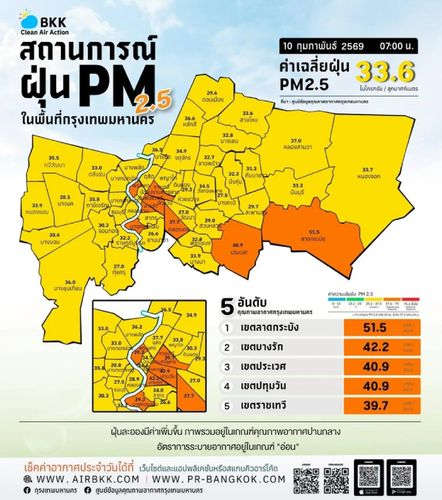 Уровень PM2.5 в Бангкоке 10 февраля 2026 года в среднем остаётся ниже официального стандарта, однако в ряде районов уже зафиксирован «оранжевый» уровень загрязнения, способный негативно влиять на здоровье. Жителям рекомендуется носить защитные маски и ограничивать активность на открытом воздухе, особенно в районах с повышенными показателями загрязнения.